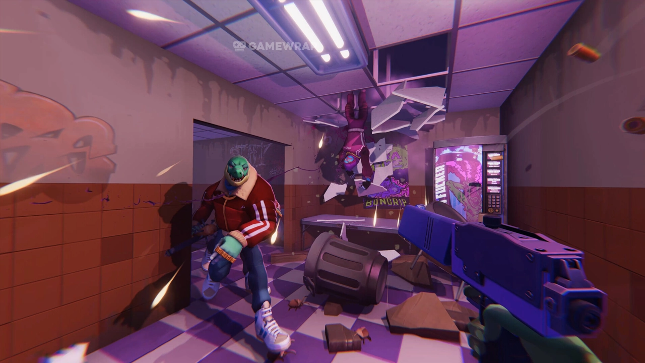 Kick and shoot your way to the exit as you leave behind a smoldering trail of shattered doors, broken bones, and crumpled energy drinks.