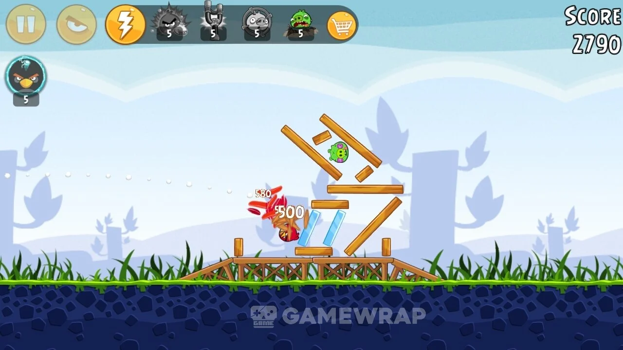 The game takes place across multiple levels, each featuring a unique structure made of various materials like wood, stone, and ice.
