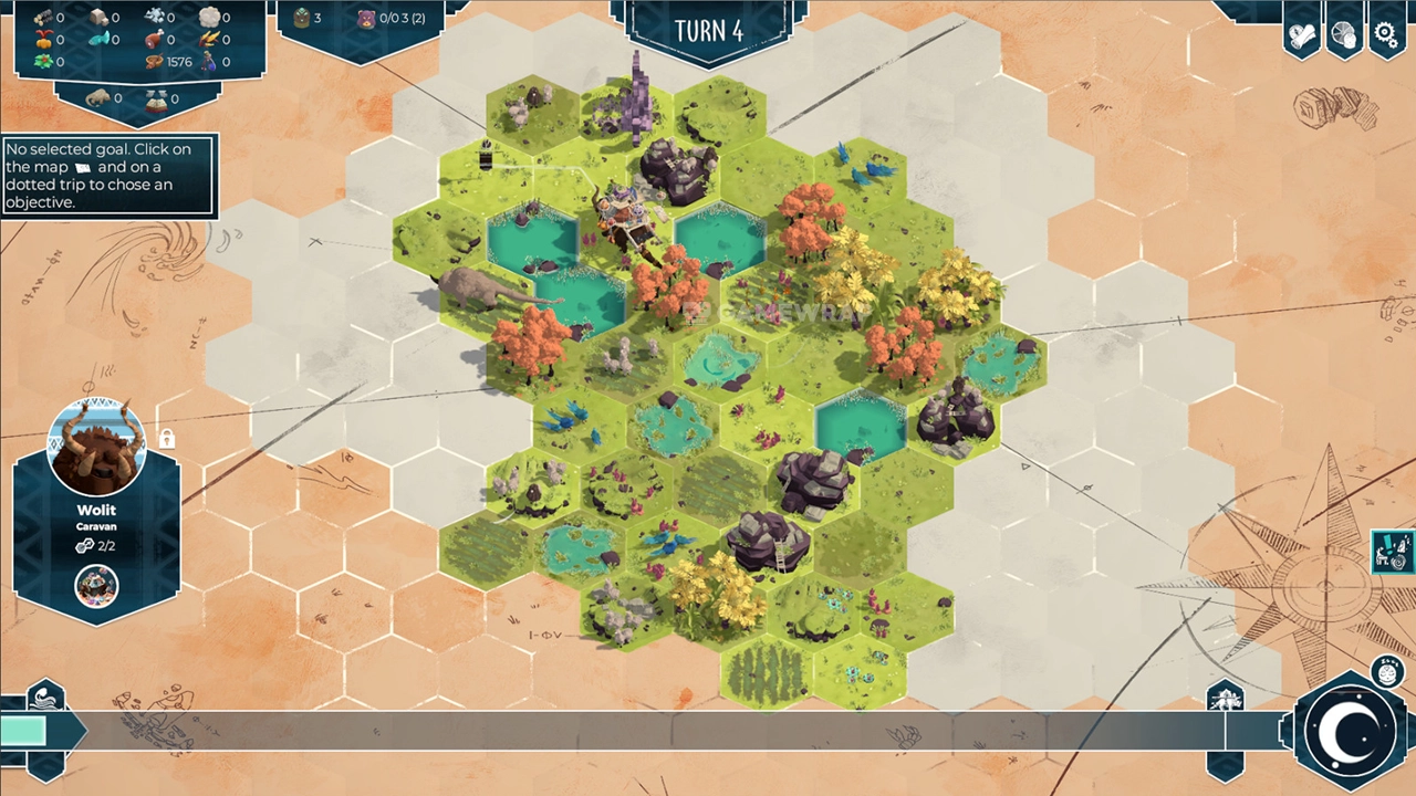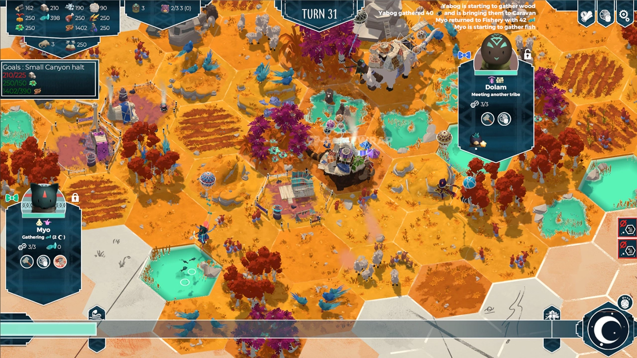 The game is a nomadic turn-based city builder. Begin a procedurally generated journey and survive halt after halt, as far as the Eye.