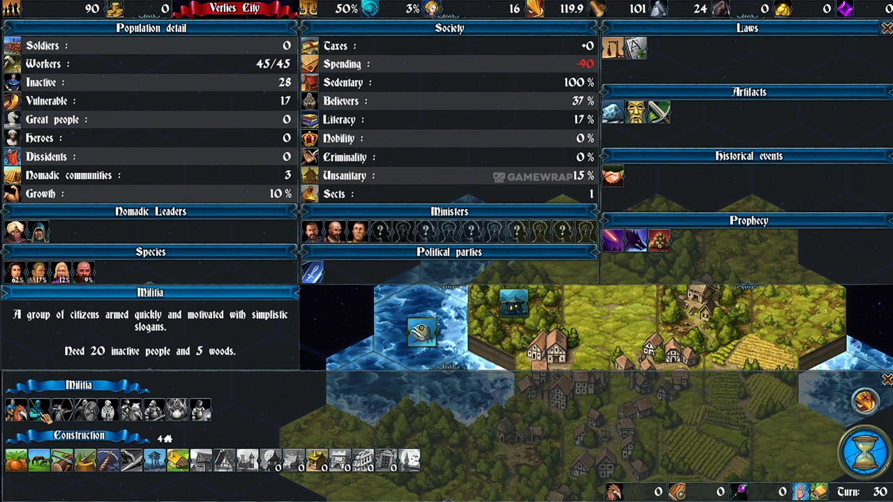 The population serves as a primary resource. Your people require feeding, education, training, and arming. Their development is influenced by your laws, choices, events, and their plans. Issues like fanaticism, inequalities, and revolts can lead to the civilization's downfall.