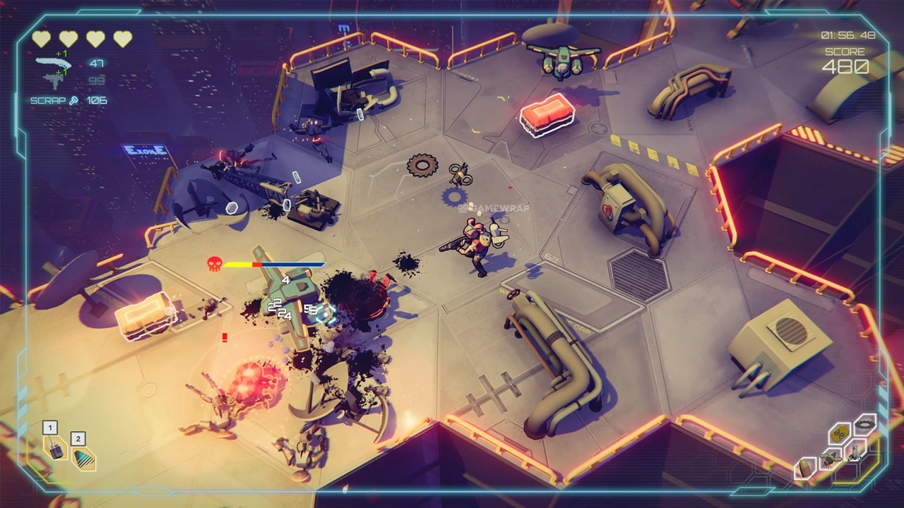 Players can collect scrap and craft upgrades using a workbench between missions. Over 50 unique items include: