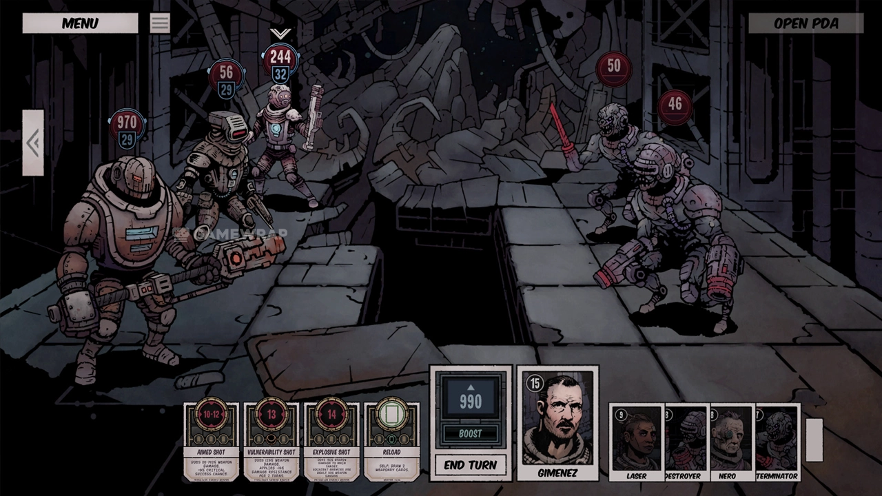 Challenge and defeat them in tactical turn-based fights, where randomly drawn cards form your changing arsenal of combat actions, gain experience for yourself and your crew, loot dead bodies, resupply, and upgrade once back at your base.