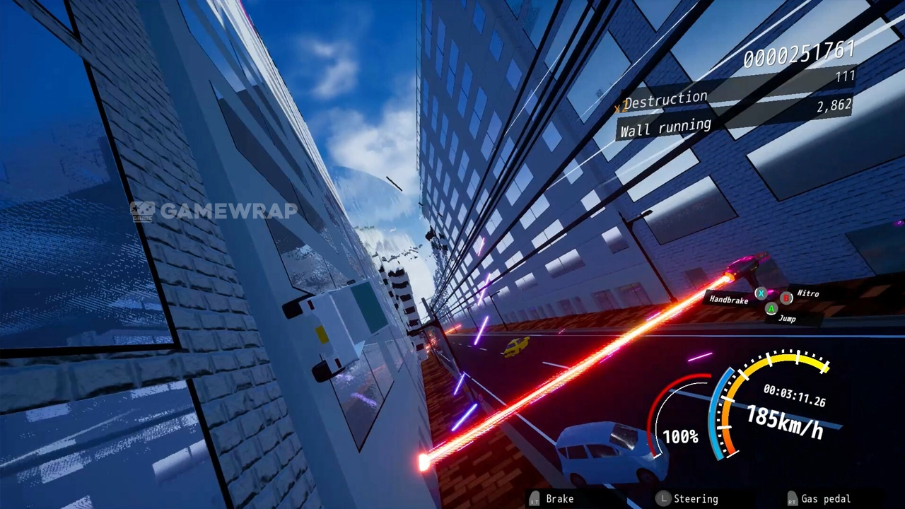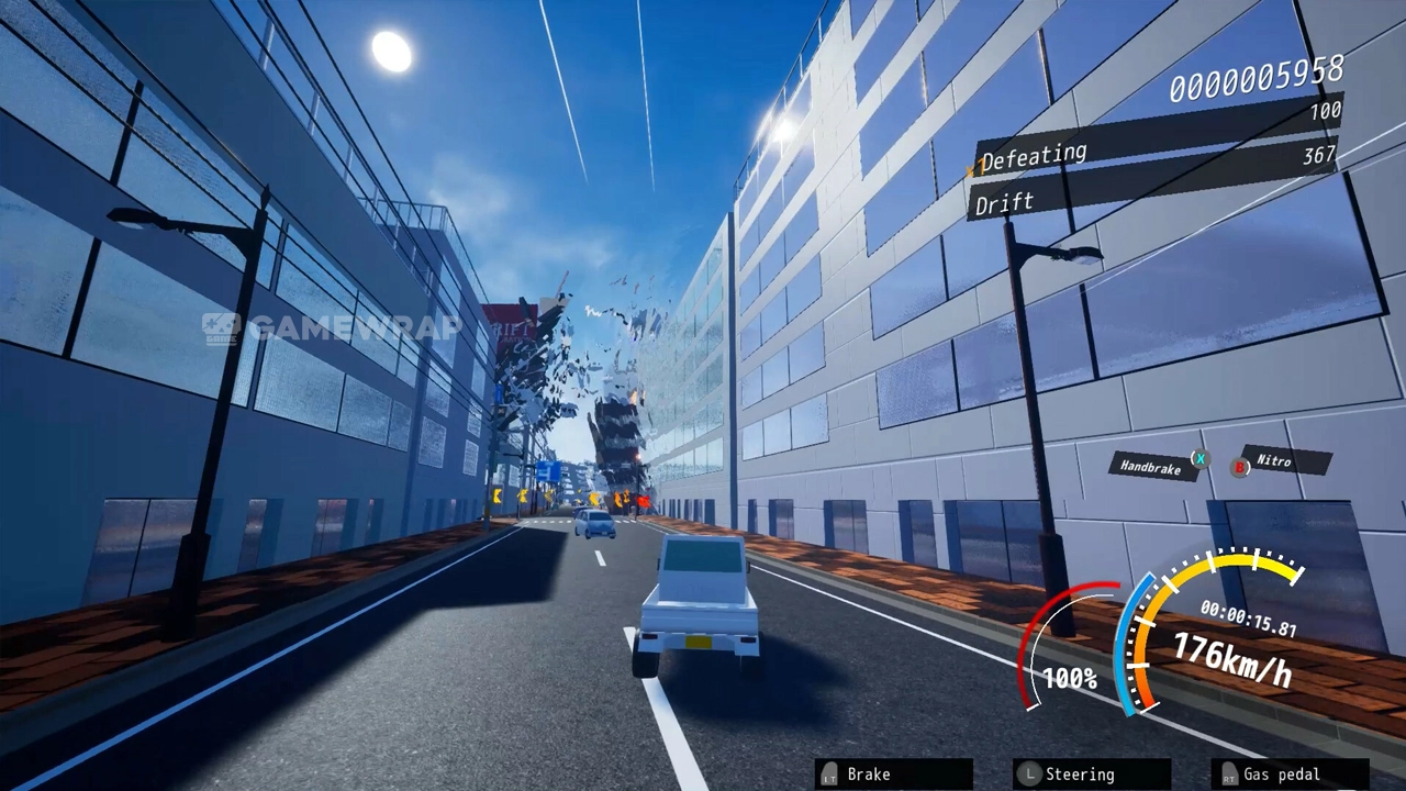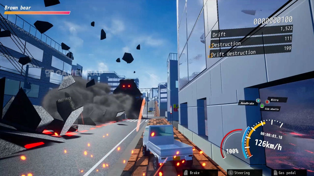 You dodge collapsing buildings, missiles, and attacks from mysterious mechanical life forms with brilliant driving techniques, destroying utility poles, street trees, and guardrails, and Running through offices and walls. and fight giant creatures.