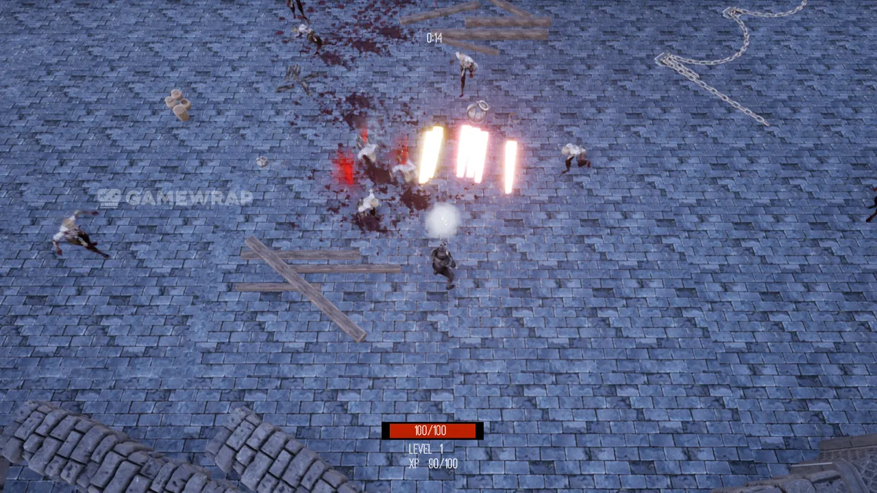 Using 4 different handguns you must survive inside a dungeon room filled with zombies. Each time you level up there is 3 different options to choose from, you can upgrade your weapons, your stats or unlock skills.