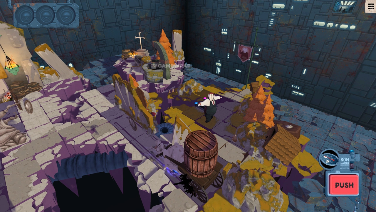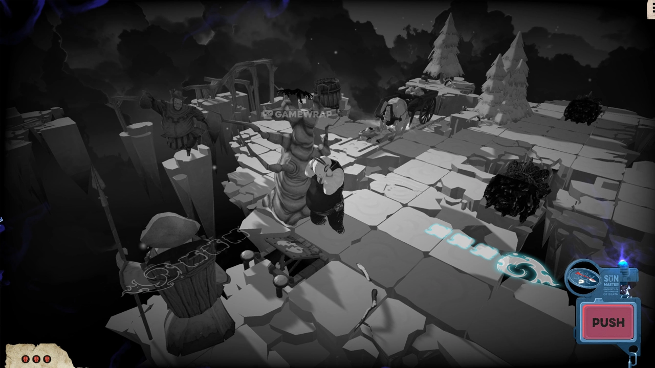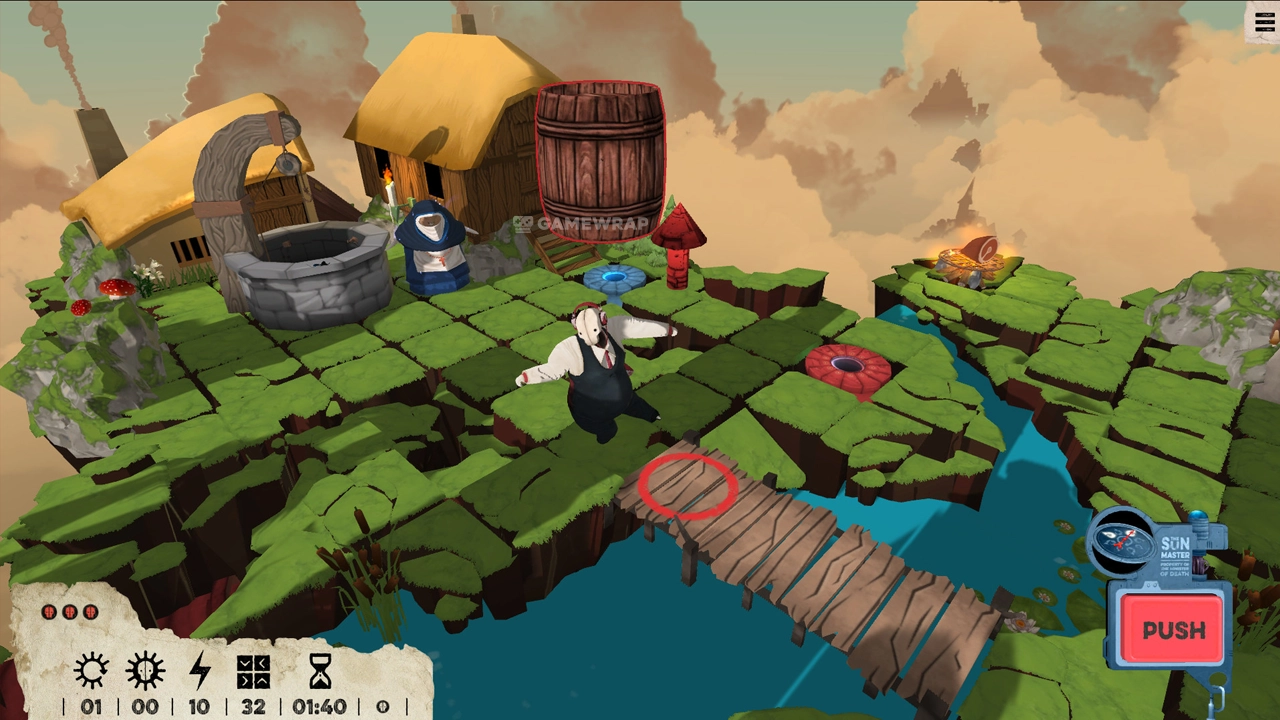 Felix can rotate the sun, and move objects, to create new pathways for him to reach his target.