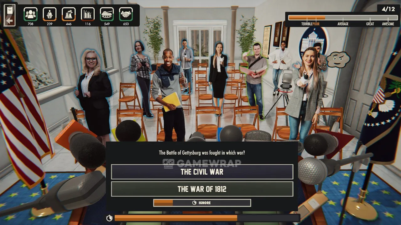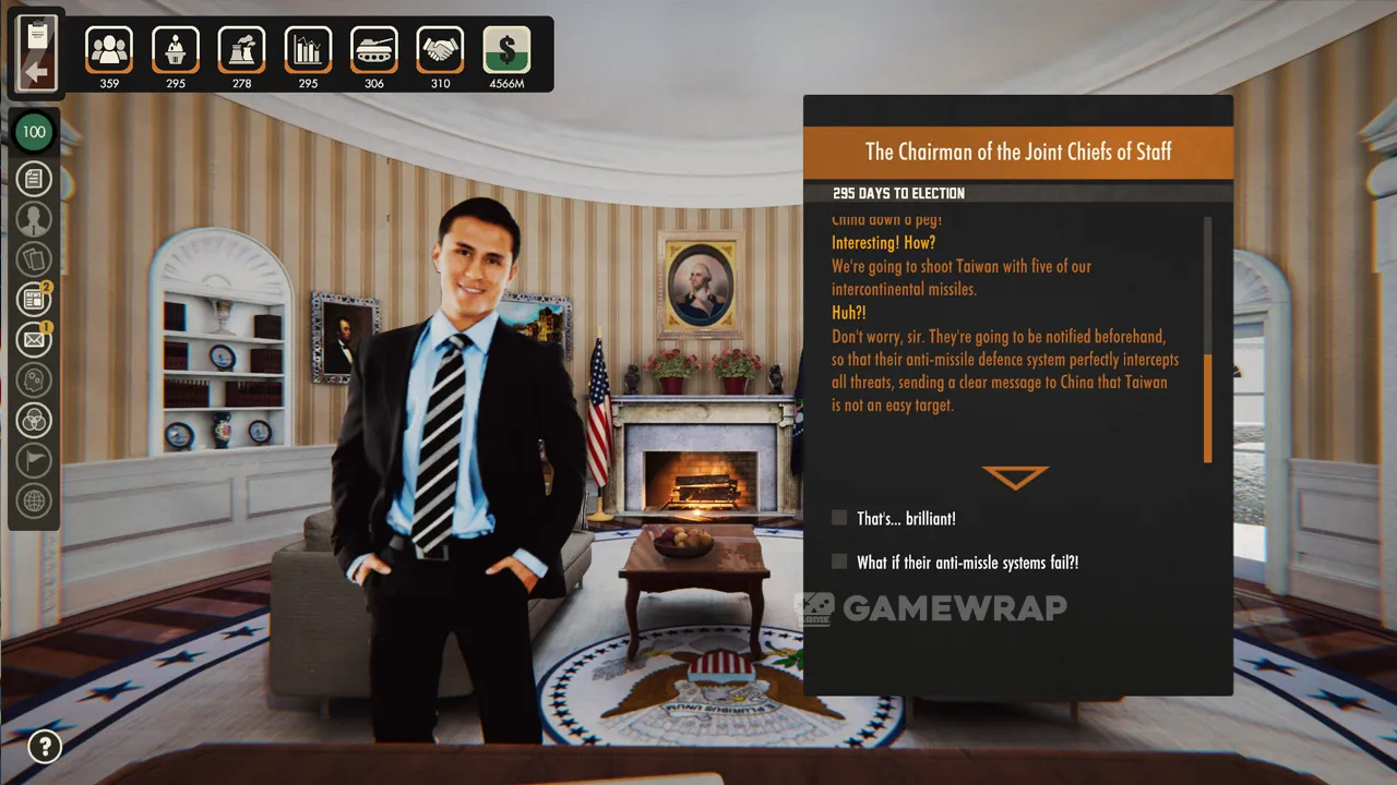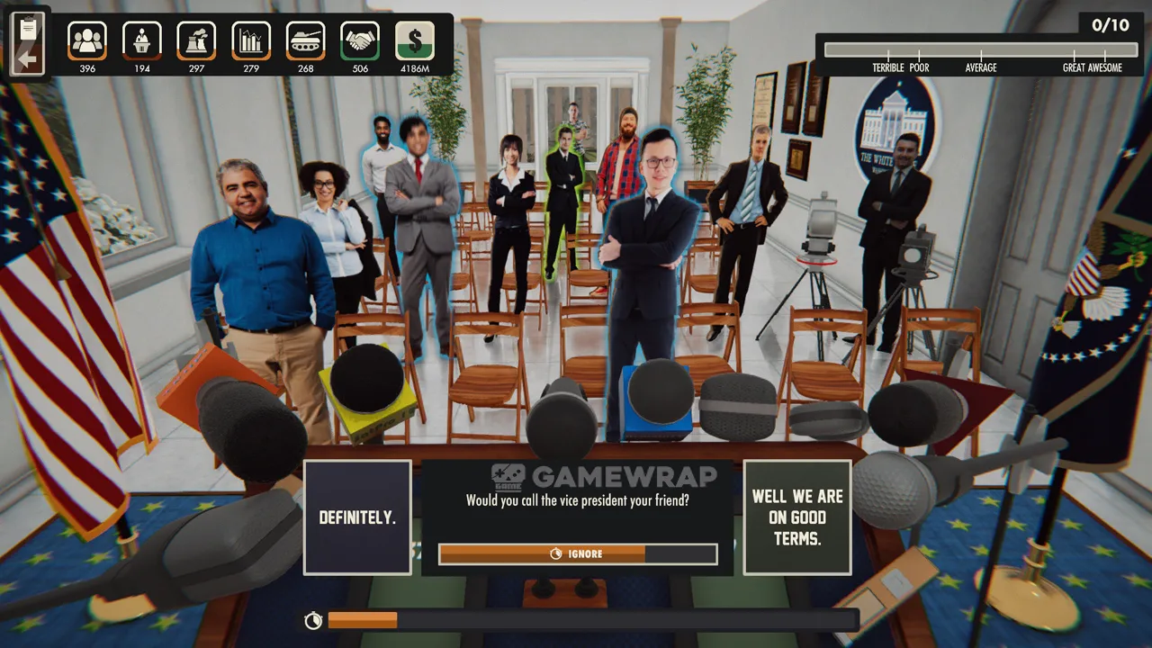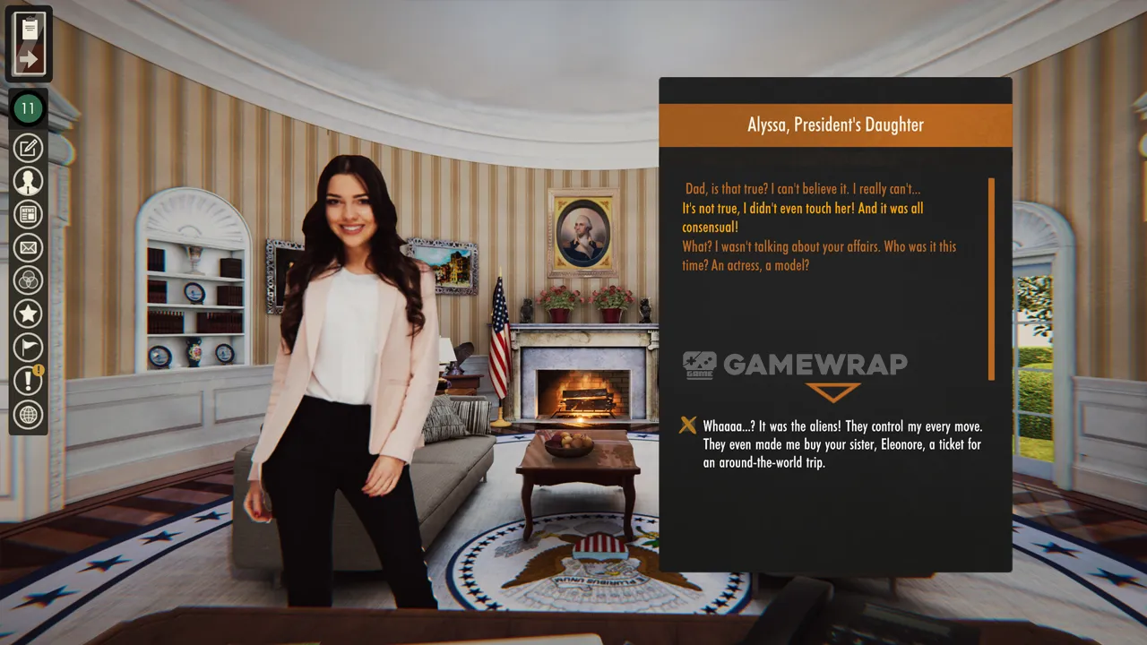 Get into the character of Mister President and choose the answers that best suit the situation. Different options can help you make allies but also enrage your previous supporters.