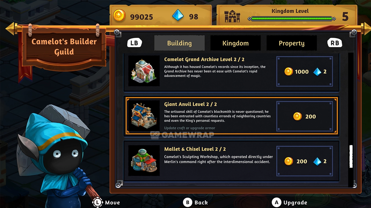 Visit the Builder’s Guild and construct shops and amenities to raise your kingdom level and call upon the talents of your citizens.