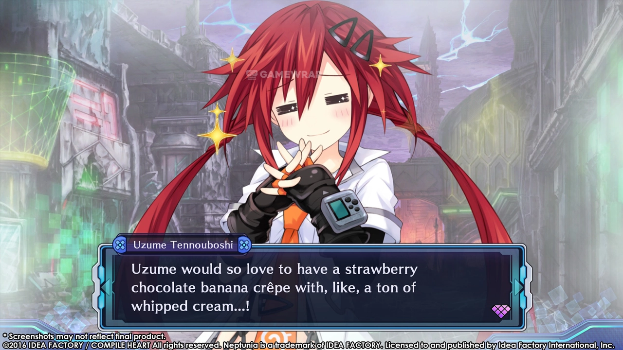 The game occurs in a post-apocalyptic version of Gamindustri, a world based on the real-world game industry. Neptune and Nepgear, the series' protagonists, find themselves transported to this desolate land, where they must team up with a local CPU, Uzume Tennouboshi, to defeat giant Dark CPUs and restore their home.