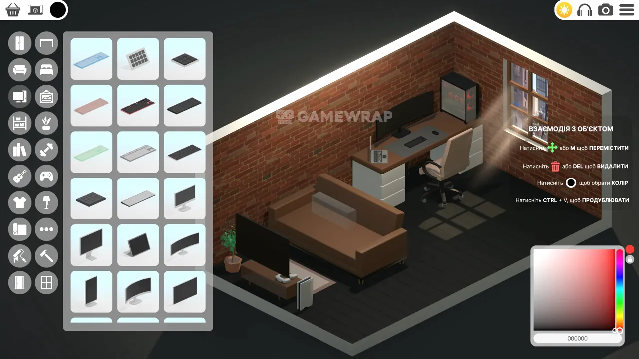 Change the colour of the furniture. All colours of the RGB palette are available to you. Each piece of furniture is customizable separately.