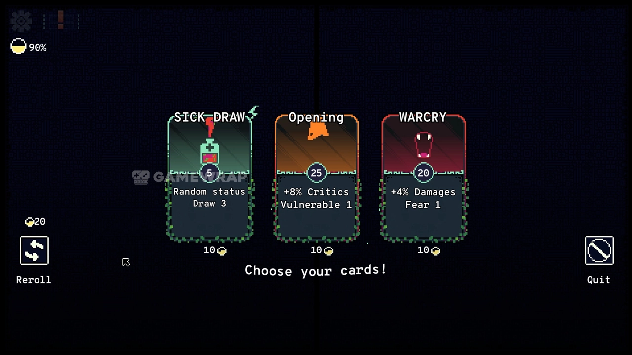 According to your play style and the dangers to come, you may choose different kinds of cards to take with you on your journey. You'll have to make a choice, and this choice will determine what options will be available to you when the time to fight comes.