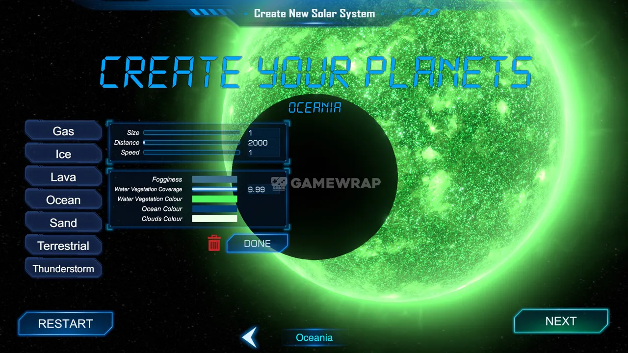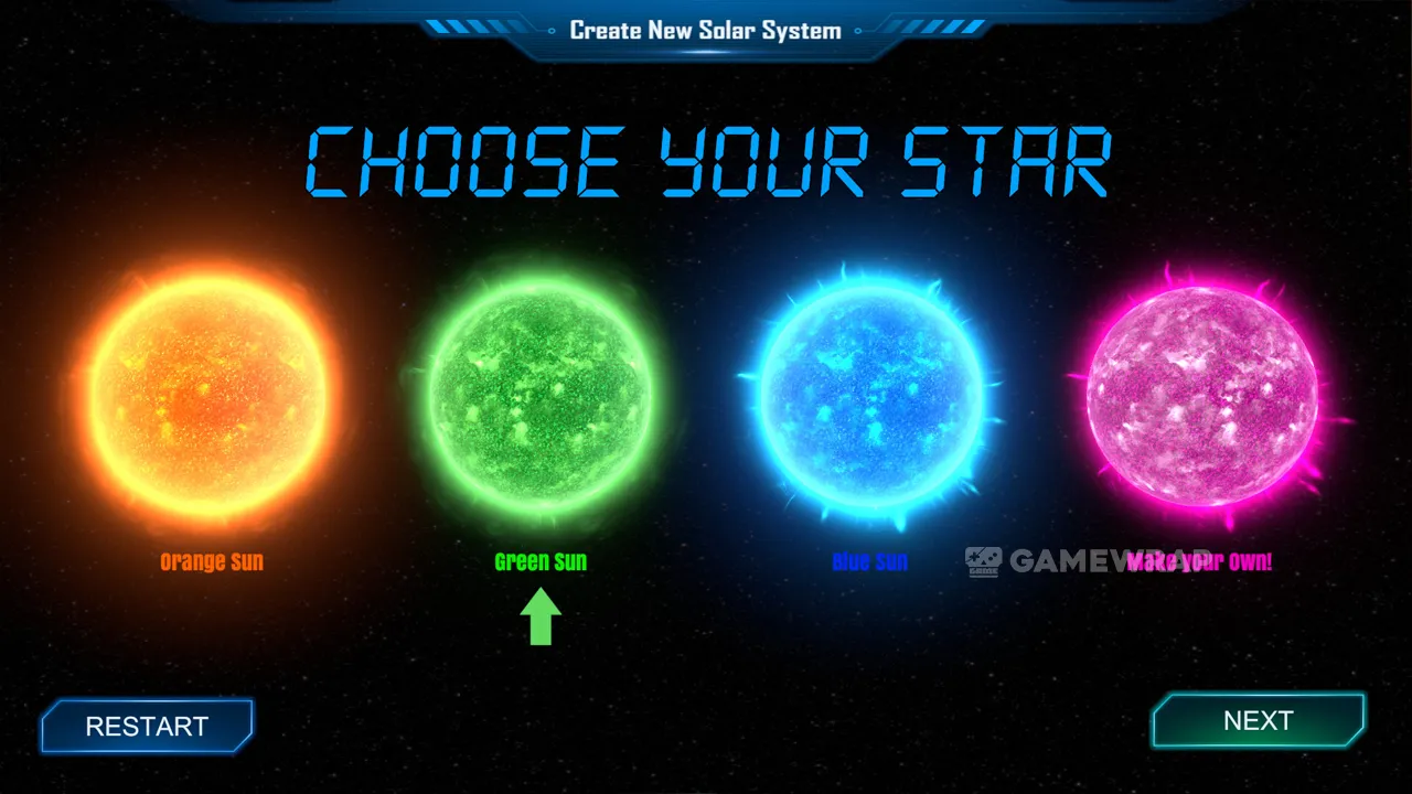 Depending on the age of the child, adult assistance may be needed. The creation of planets consists of choosing a size for the planet, distance from the star, speed of orbit, and particular attributes depending on the type of planet you or your child want to create.