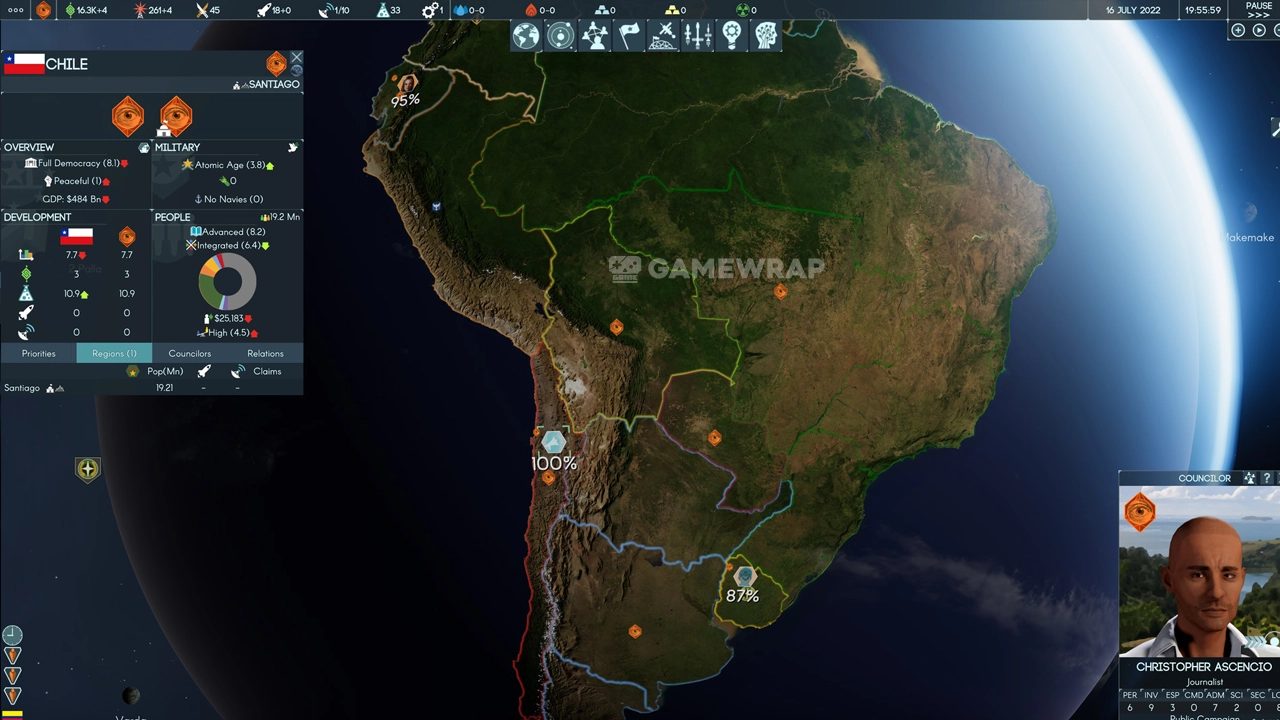 Earth’s regions are modelled in detail, from educational levels and unrest to GDP and inequality. Gaining command over regions with great monetary wealth and military power can allow you to implement your will on Earth, but the war for the Solar System will not be won without also securing regions containing space launch facilities.