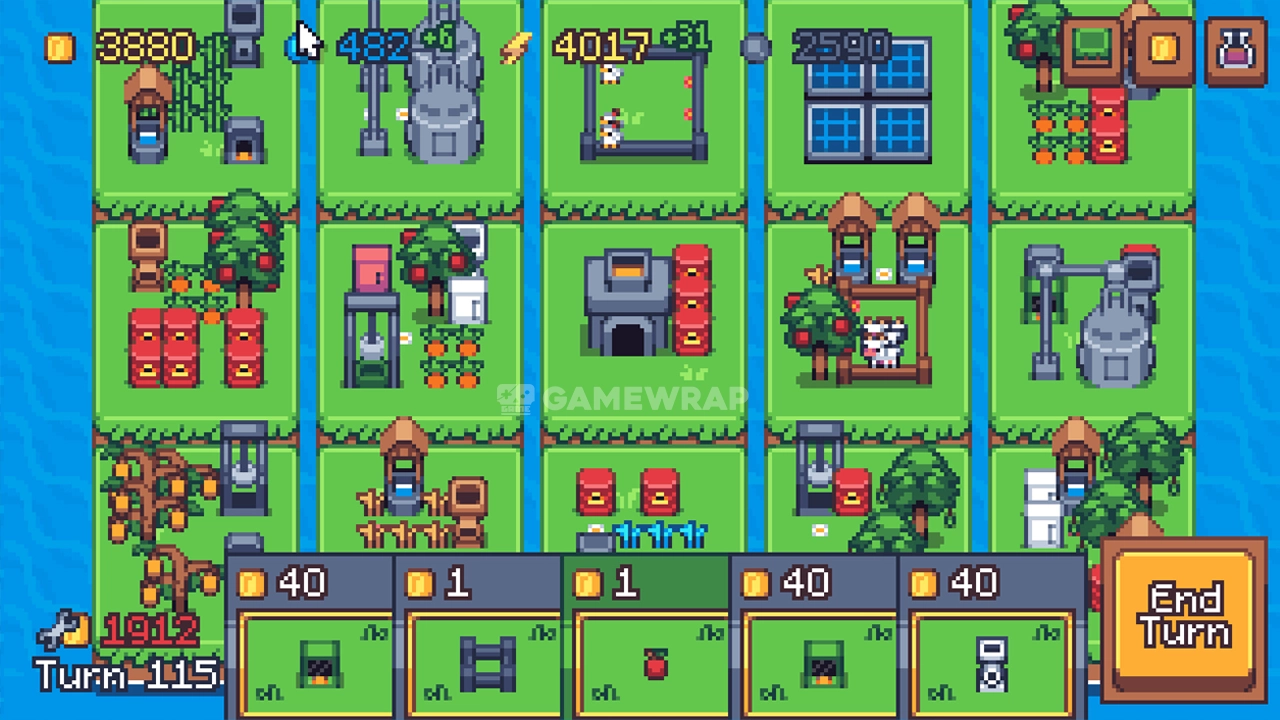 Generate items each turn, sell them for cash, and invest this money to expand your farm, pay off fees, and gradually chip away at the enormous debt.