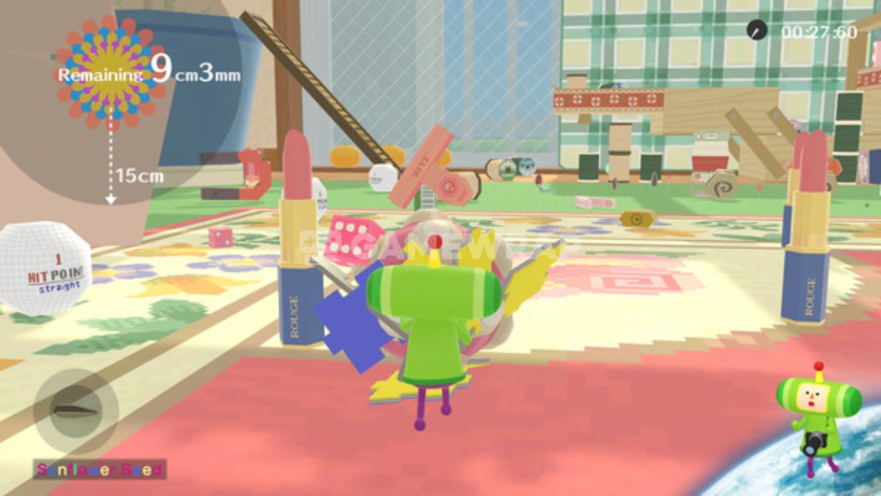 Roll the katamari, roll up objects, and make the katamari bigger.You can roll up anything from paper clips and snacks in the house, to telephone poles and buildings in the town, to even living creatures such as people and animals. Once the katamari is complete, it will turn into a star that colors the night sky.